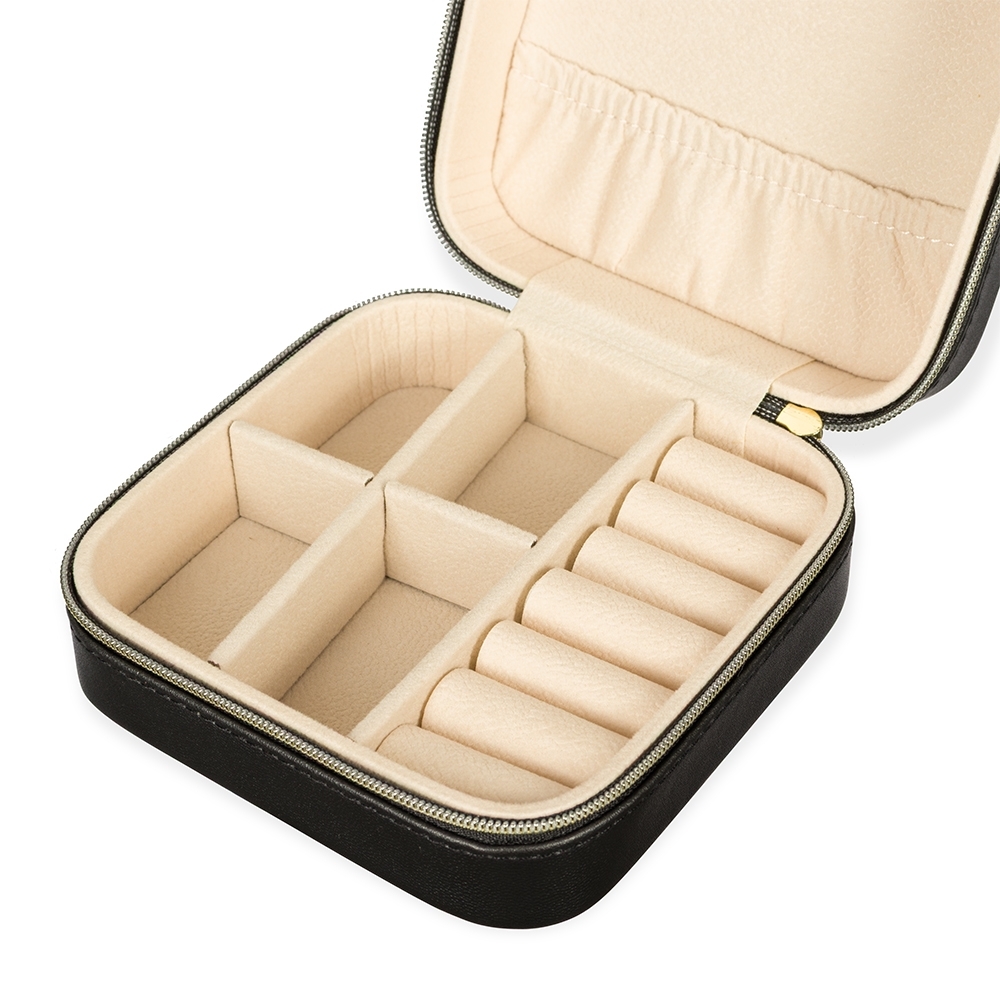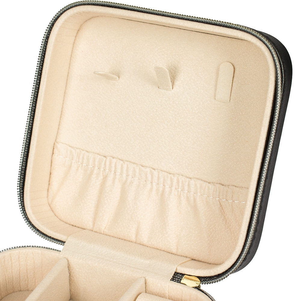 Este porta-joias em couro sintético é uma opção compacta para armazenar objetos menores com segurança. Possui revestimento interno com textura macia e fechamento em zíper, além de três mini ganchos, um bolso com elástico, uma divisória removível com quatro quadrantes e um compartimento estofado com ranhuras.