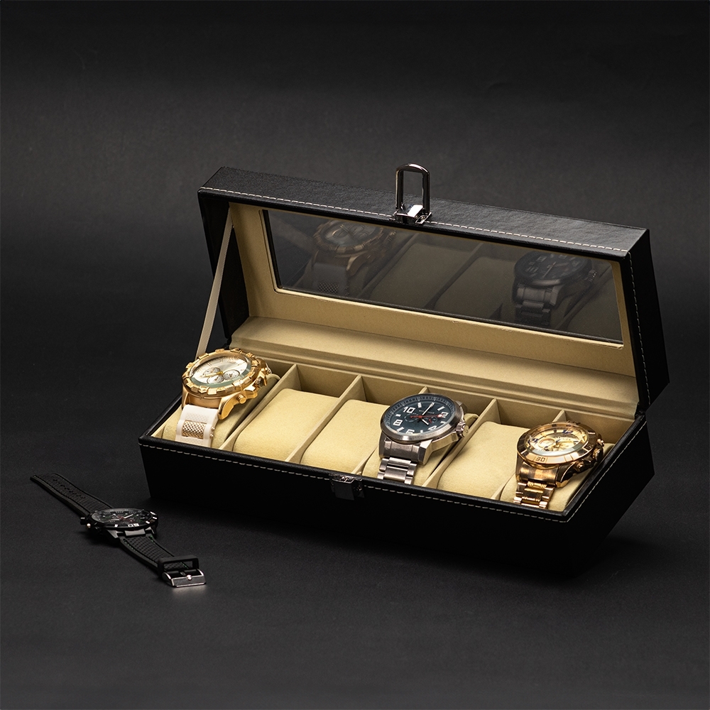 Porta-relógios com acabamento em couro sintético e interior revestido em veludo. Possui seis divisórias com almofadas removíveis, tampa com visor em acrílico e abertura em 90 graus, facilitando a visualização e o manuseio dos acessórios. Conta com trava de segurança para fechamento do estojo.