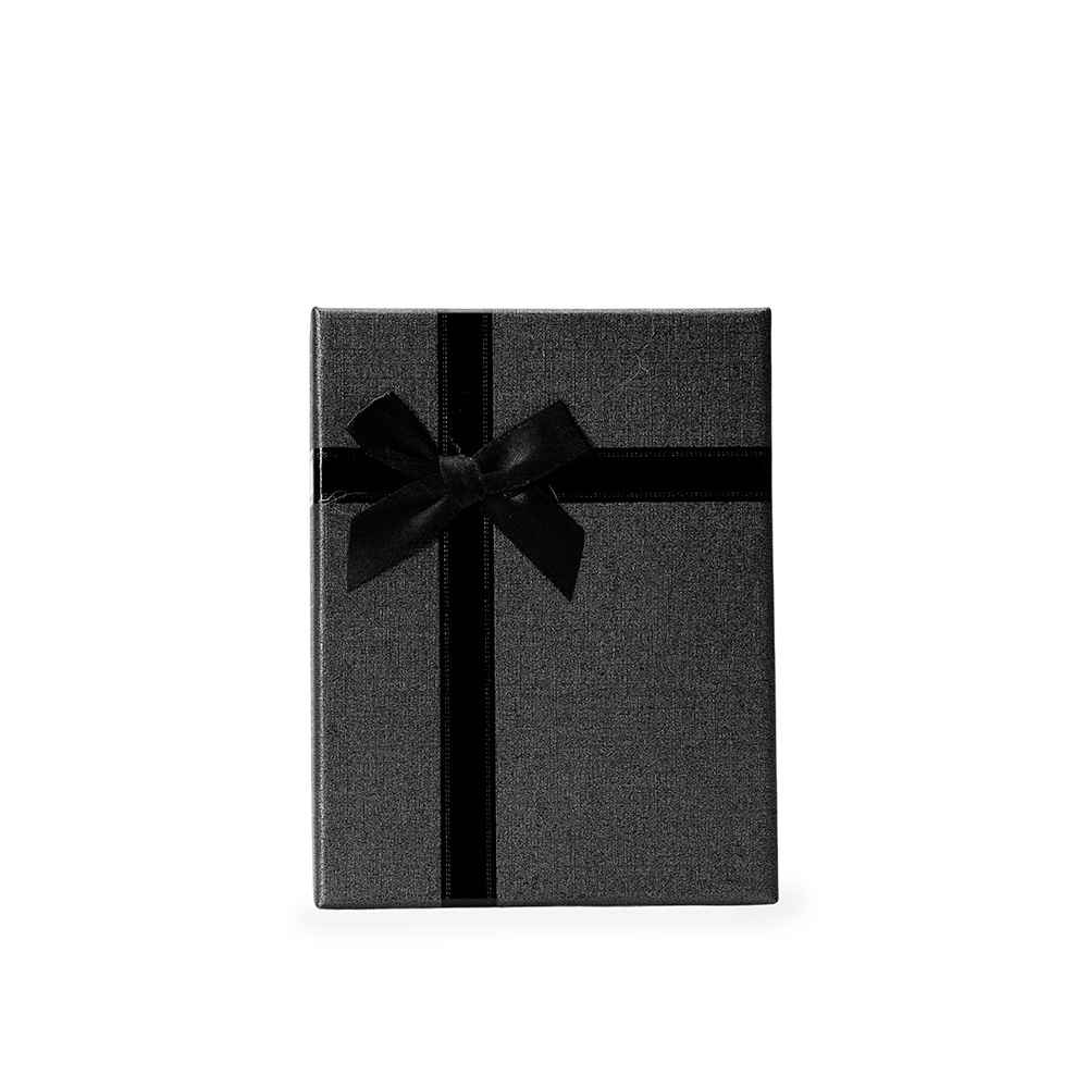 Caixa para presente feita em papelão com acabamento levemente texturizado e laço decorativo em cetim colado na tampa. Conta ainda com berço removível em espuma com ranhuras.