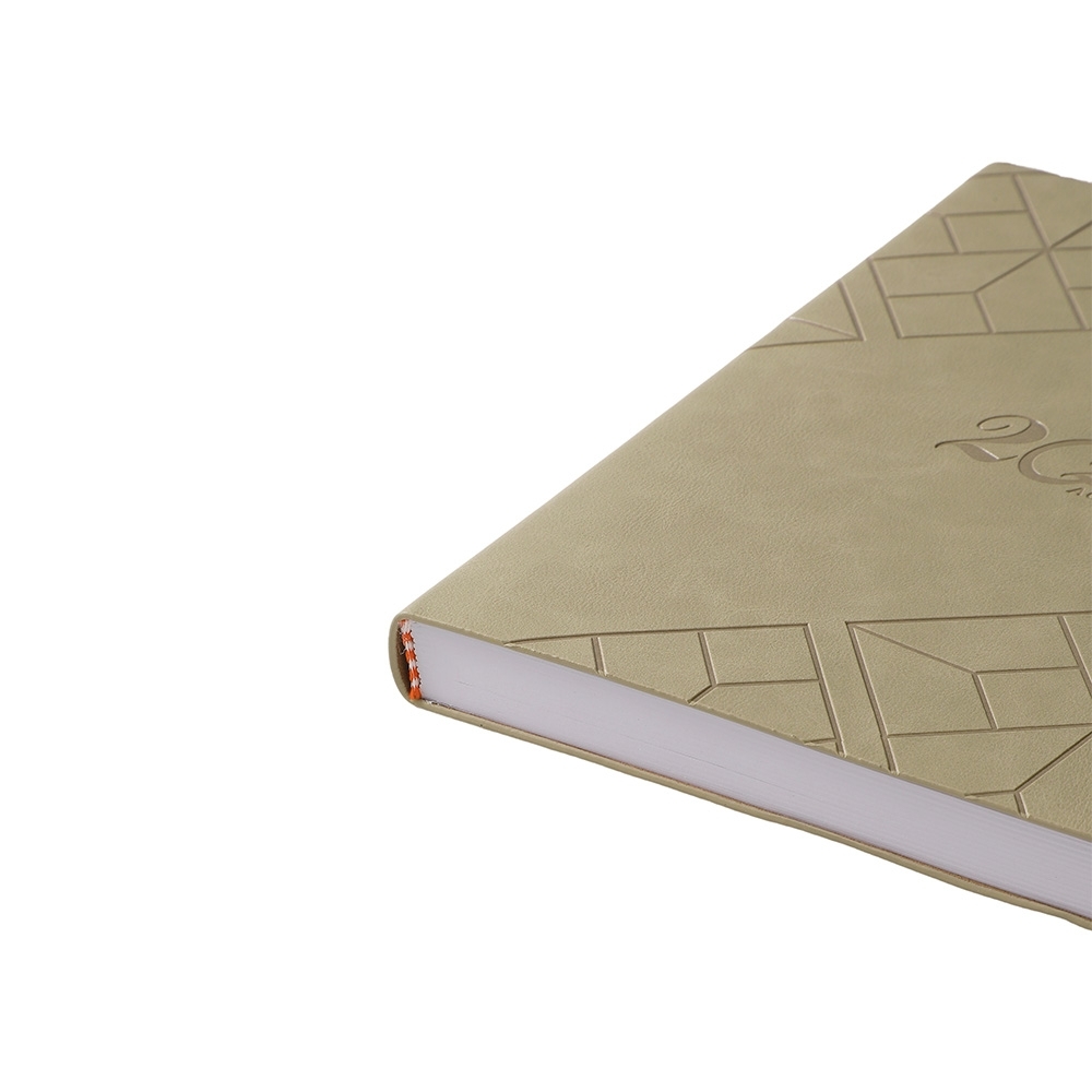 Agenda 2024 de couro sintético com abas mensais e marcador de página em cetim. Contém folhas para dados pessoais, calendários 2026 à 2028, planejamento 2026, DDI, página de conversões e páginas de contatos.