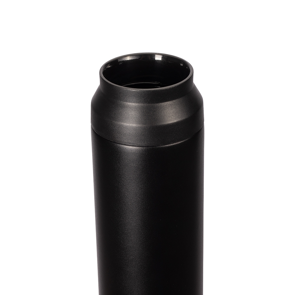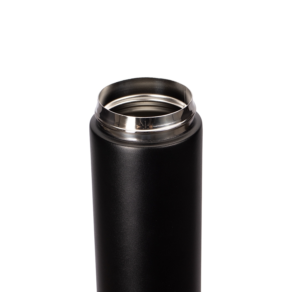 Garrafa térmica com capacidade de até 500ml. Conta com estrutura de parede dupla e isolamento a vácuo, o que permite a conservação da temperatura de bebidas por mais tempo. Possui tampa plástica rosqueável com alça para transporte e abertura em duas camadas.