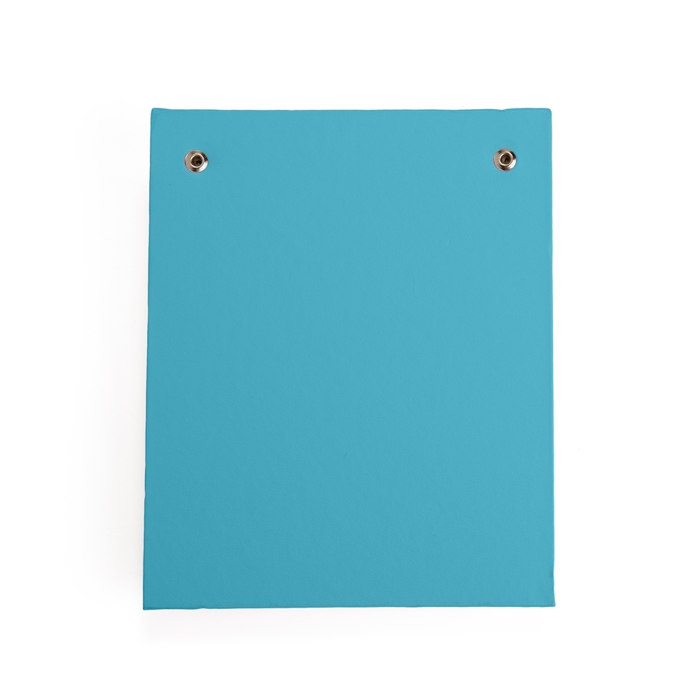 Bloco de anotações de mesa com trilho de ferro e capa dura em percalux. Possui aproximadamente 150 folhas brancas sem pauta com área destacável.