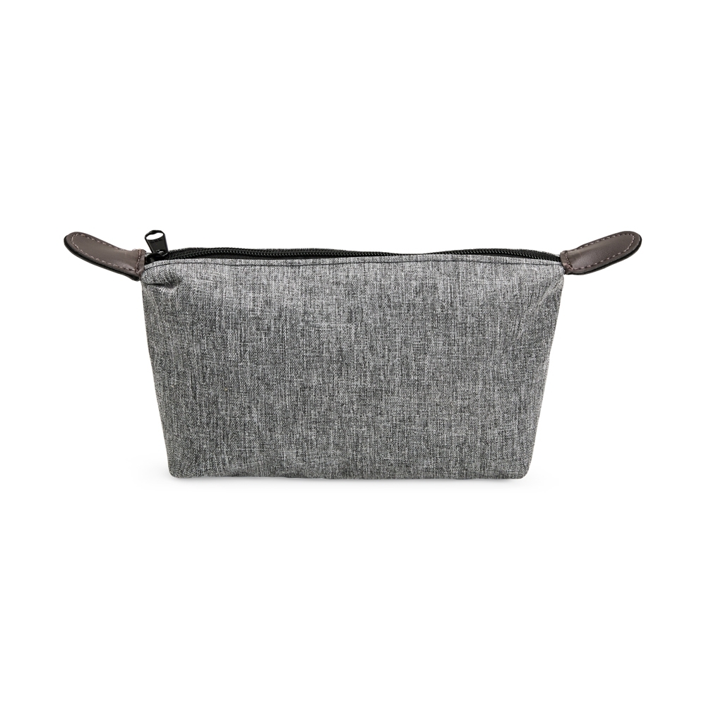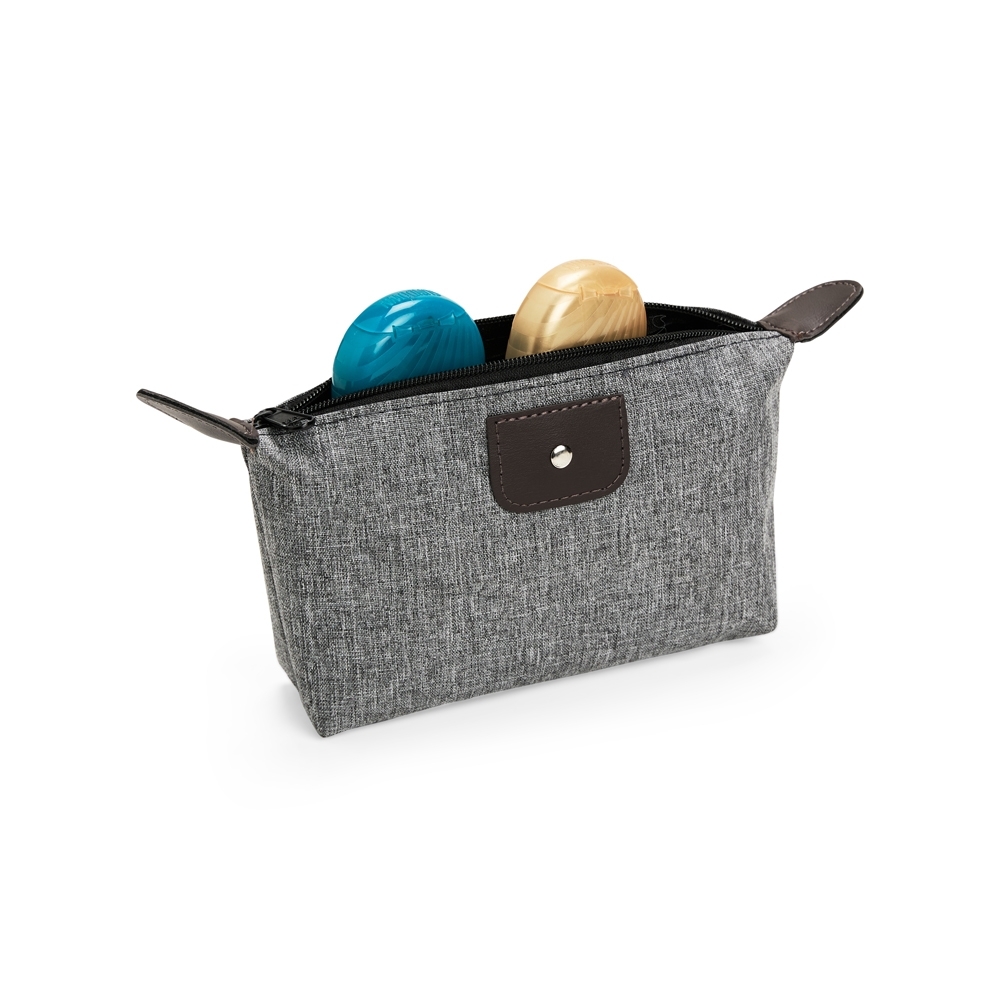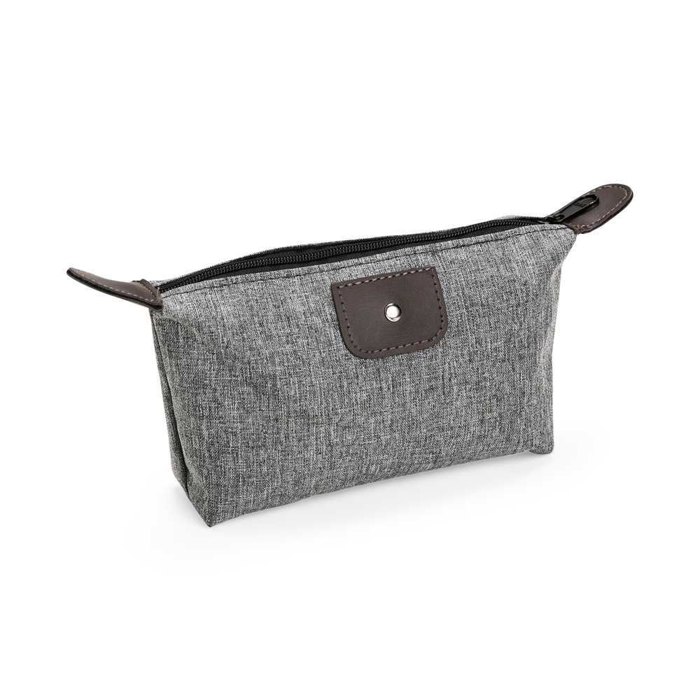 Nécessaire compacto confeccionado em Poliéster com mescla de PVC resistente à água, com fechamento em zíper e detalhes em bidim e metal.