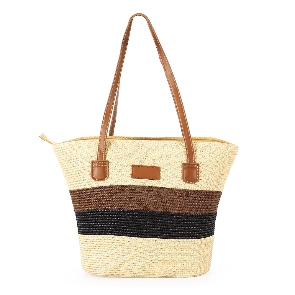 Bolsa feita em fios de papel torcido costurados com linha de nylon. Possui fechamento em zíper, compartimento interno com bolso compacto, alças e detalhes em couro sintético, incluindo plaquinha frontal costurada.