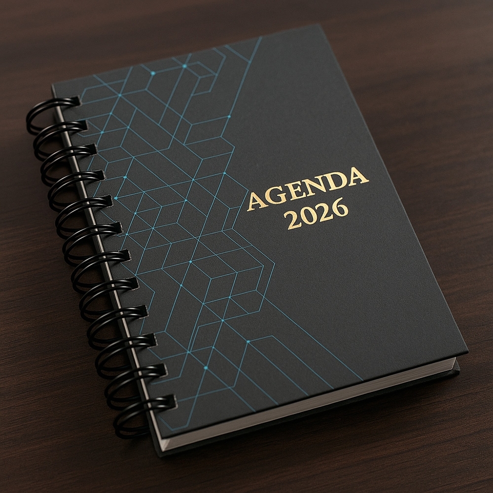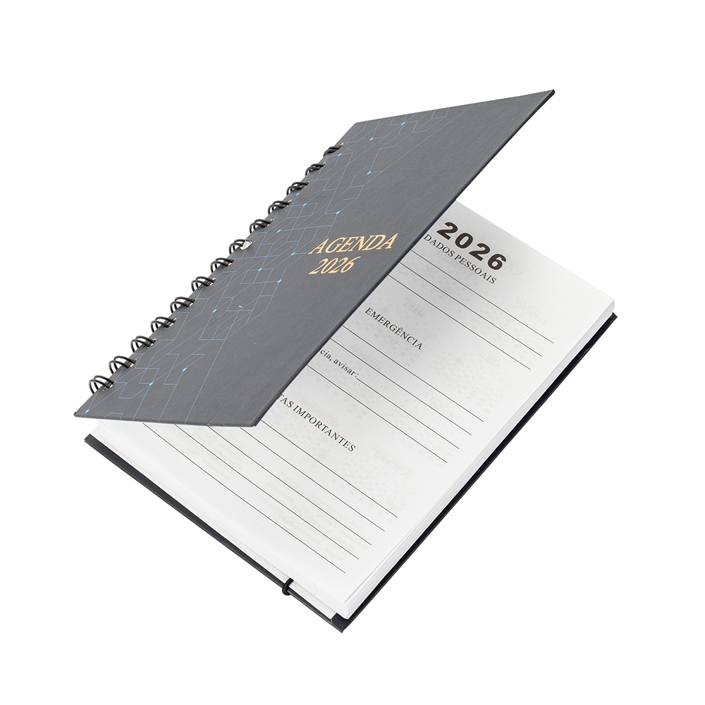 Agenda diária em capa dura, encadernação Wire-O, elástico de fechamento e marca-páginas em cetim. Contém ainda páginas dedicadas a dados pessoais, calendários de 2026 a 2028, planejamento mensal e lista de contatos.