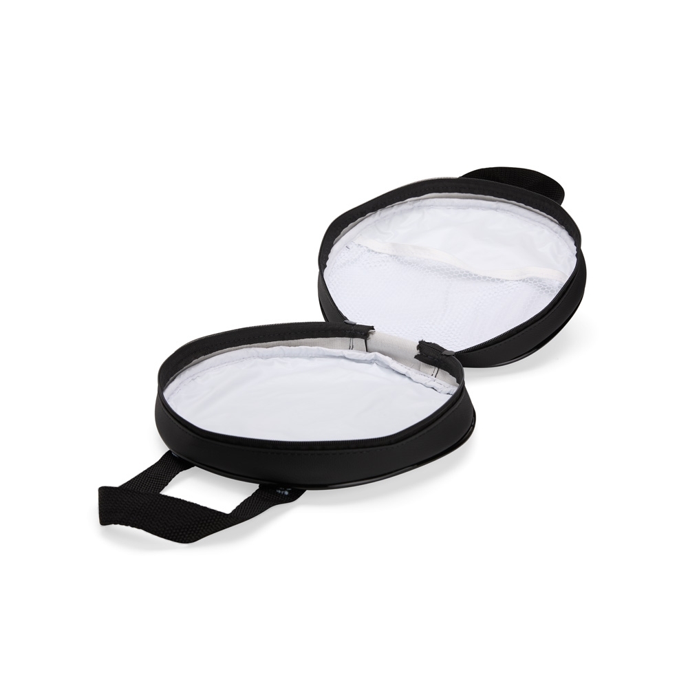 Bolsa porta-pratos em couro sintético e fechamento em zíper. Possui compartimento interno que inclui bolso em tela de nylon, além de duas alças para transporte.