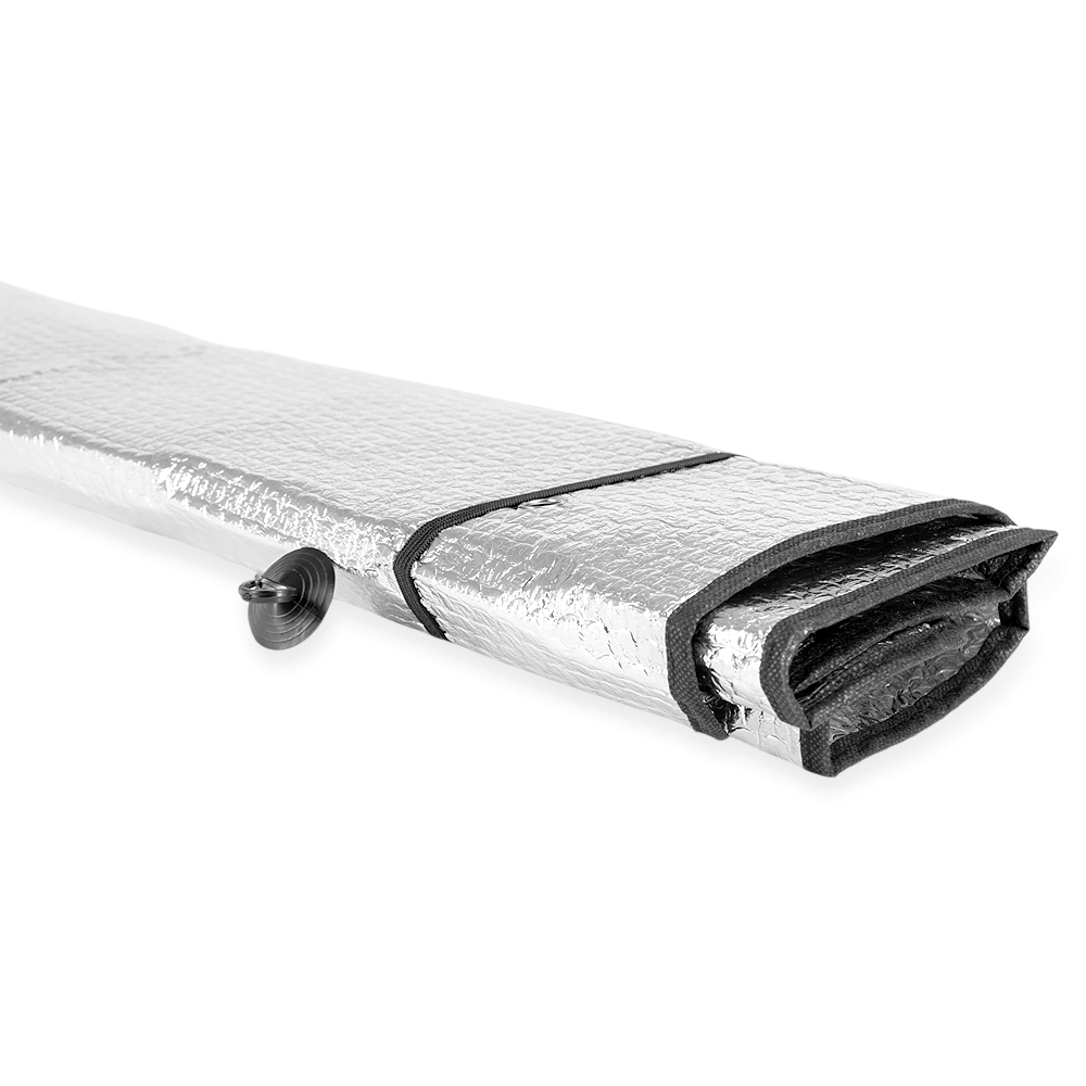 Protetor de para-brisa dobrável feito em alumínio reflexivo com bordas em nylon e um par de elásticos fixos que mantêm o protetor dobrado fora de uso. Acompanha duas ventosas para fixação no vidro do carro.