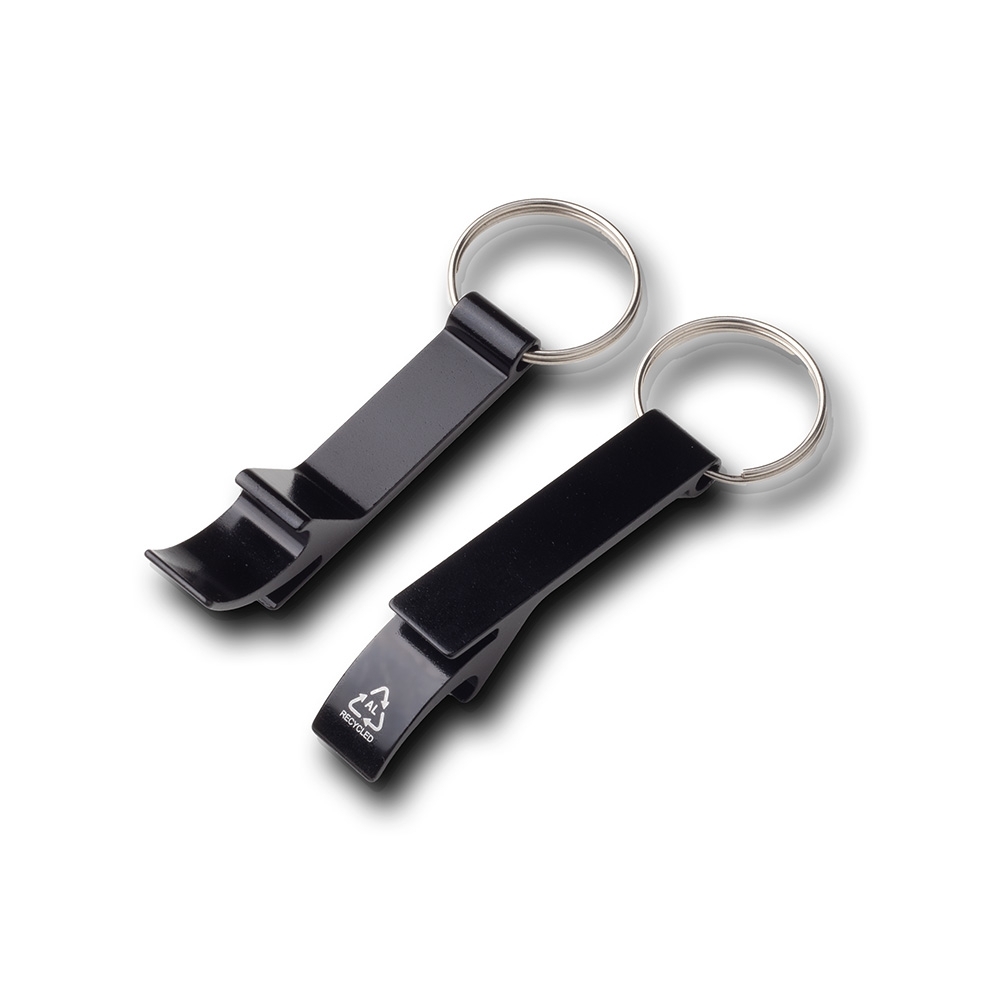 Kit composto por uma caneta e um chaveiro abridor, ambos fabricados em alumínio reciclado. O abridor possui formato de pé de galinha, próprio para abrir tampas de garrafas. A caneta tem corpo sextavado com régua impressa em uma das faces, acionamento por clique e ponteira touch emborrachada para uso em dispositivos touchscreen, além de carga esferográfica azul de 1,0 mm. Acompanha estojo de papelão com berço de espuma revestido em tecido aveludado.