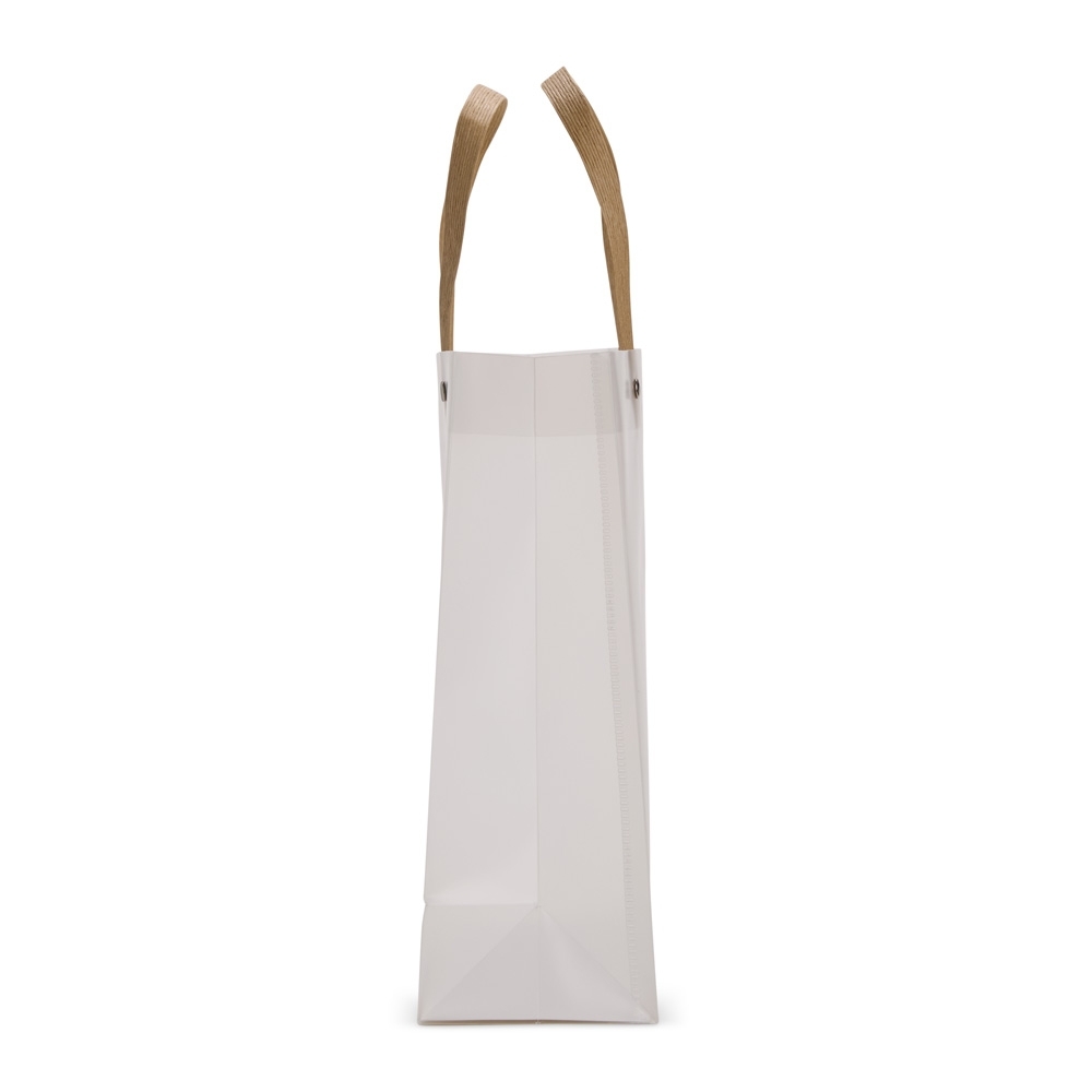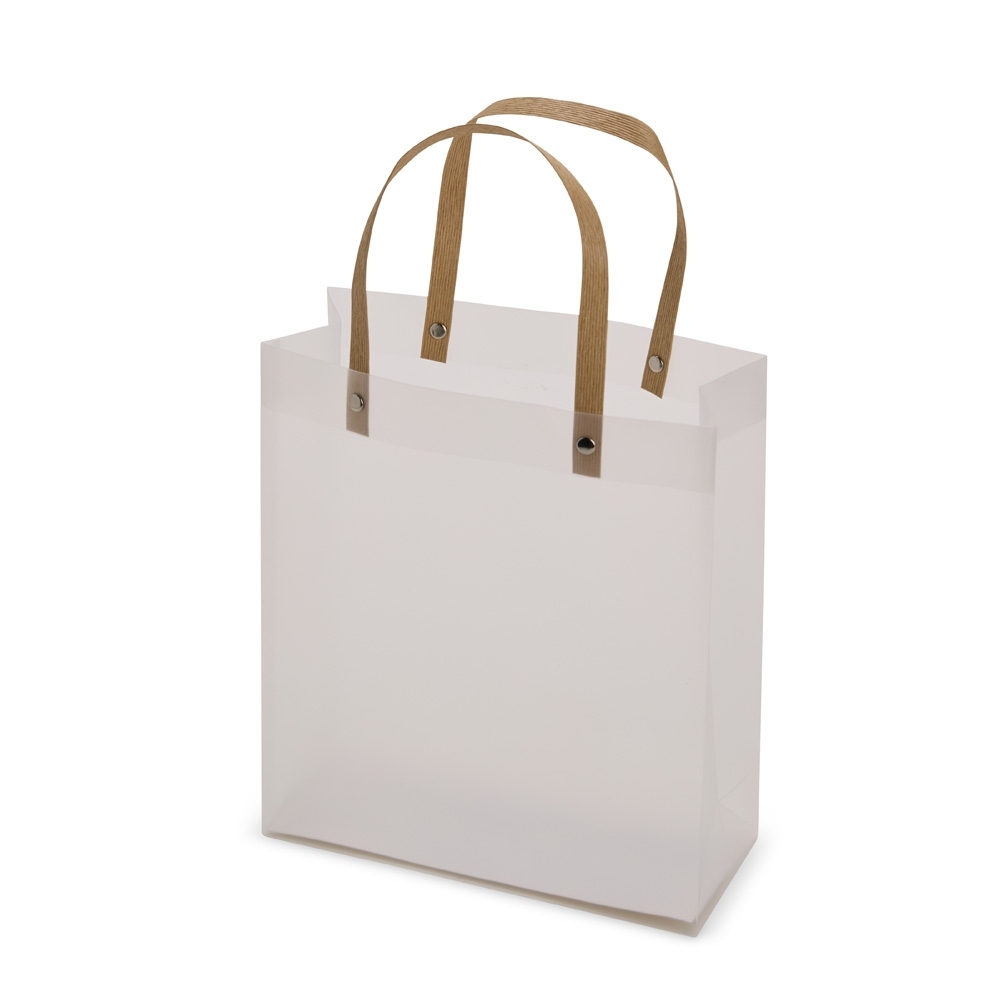 Sacola plástica com acabamento fosco e alças em papelão fixadas por botões metálicos.