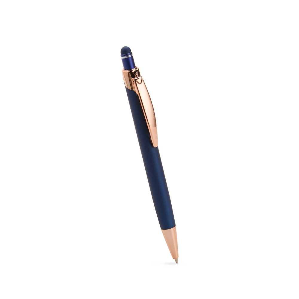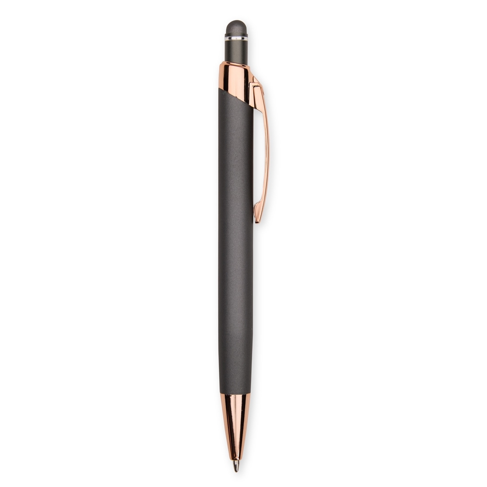 Caneta metálica com carga esferográfica azul de 1,0mm e acionamento por clique de revestimento emborrachado para interação em dispositivos com telas sensíveis ao toque.
