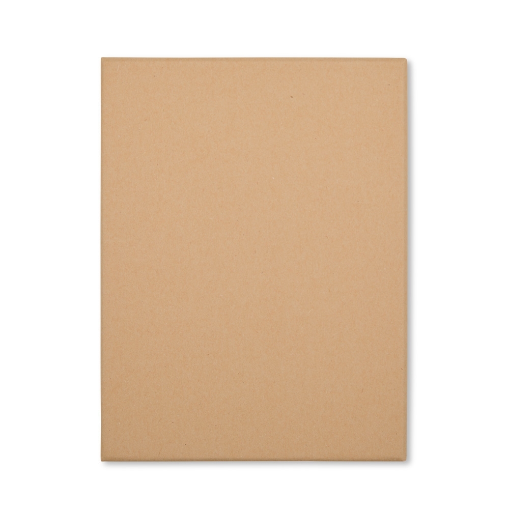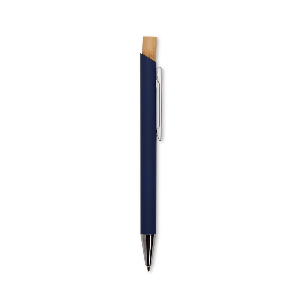 Kit executivo composto por uma caderneta e uma caneta. A caderneta possui capa dura, marca-páginas em fita de cetim e elástico para fechamento, além de aproximadamente 80 folhas com pauta. Por sua vez, a caneta metálica conta com detalhe em bambu, acionamento por clique e carga esferográfica azul de 1,0mm. Acompanha uma caixa de papelão com berço interno em espuma.