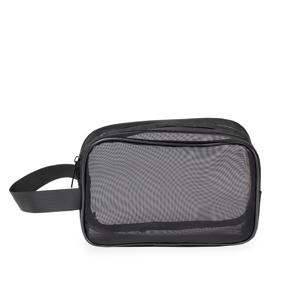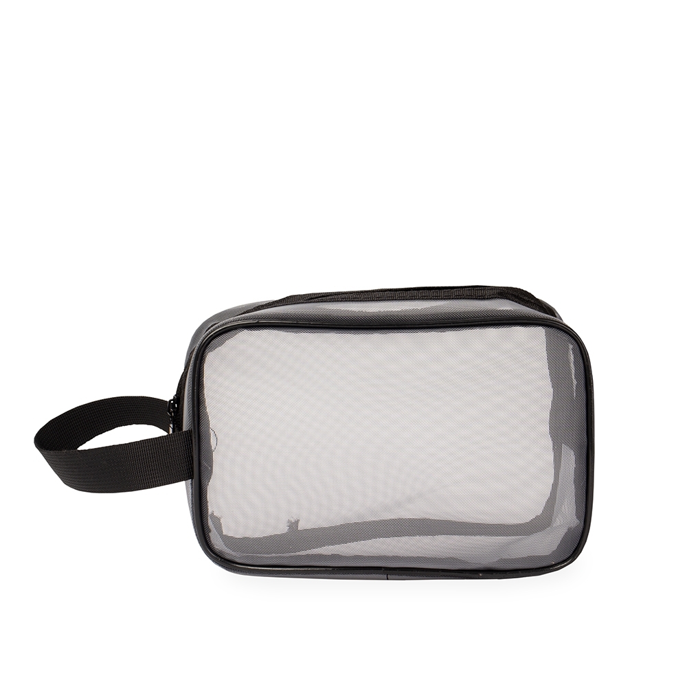 Nécessaire confeccionada em tela de nylon com fechamento em zíper e alça lateral para transporte.