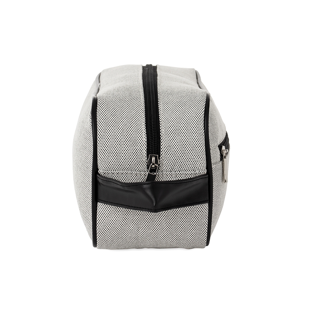 Nécessaire confeccionada em lona e fechamento em zíper. Possui bolso frontal e compartimento principal com três bolsos internos, além de alça lateral e plaquinha costurada em couro sintético.